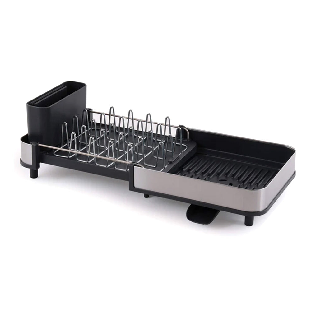 This compact dish drainer expands when you need extra drying space. Adjustable steel prongs secure dishes, while a three-position draining spout prevents water build-up.