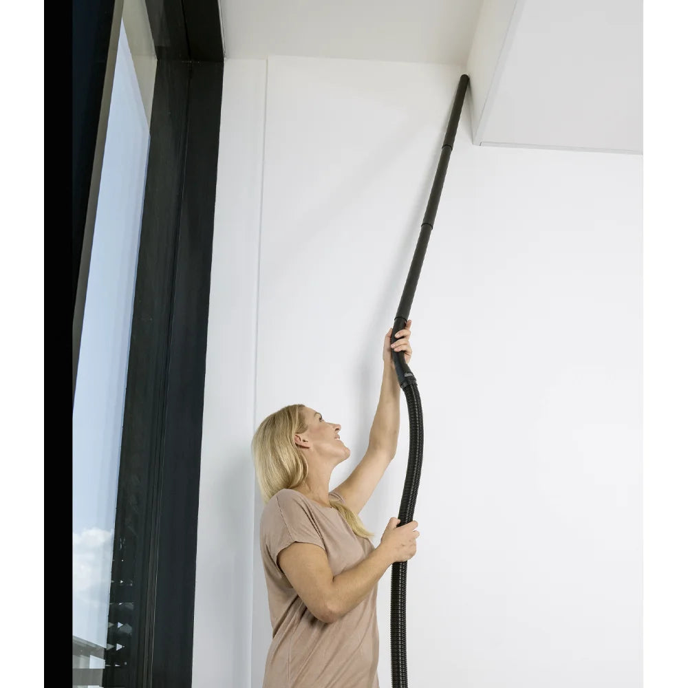 Practical extension suction tube for greater operating range. The extension of the suction tube is recommended particularly for applications in areas that are difficult to access, such as high ceilings.